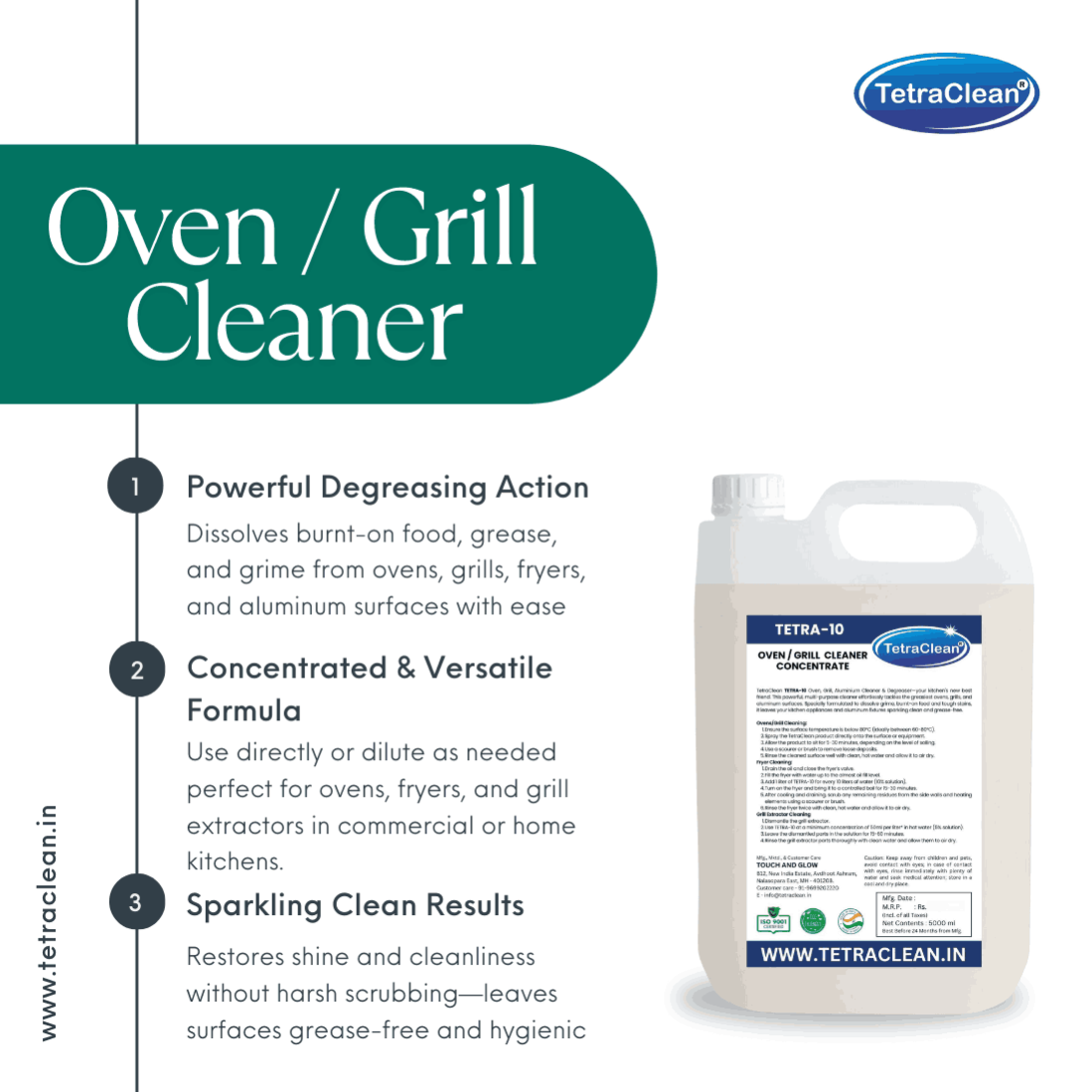 TetraClean TETRA-10 Oven & Grill Cleaner Concentrate is a powerful degreaser specially designed to tackle the toughest kitchen messes. Its advanced concentrated formula effectively dissolves burnt-on food, stubborn grease, and grime from ovens, grills, fryers, and aluminum surfaces with ease.
