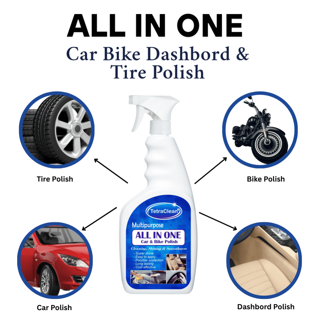 TetraClean All-in-One Car & Bike Polish gives instant shine and long-lasting protection to dashboards, tyres, leather, plastic, and metal surfaces. Easy to use, safe formula with no harsh chemicals.