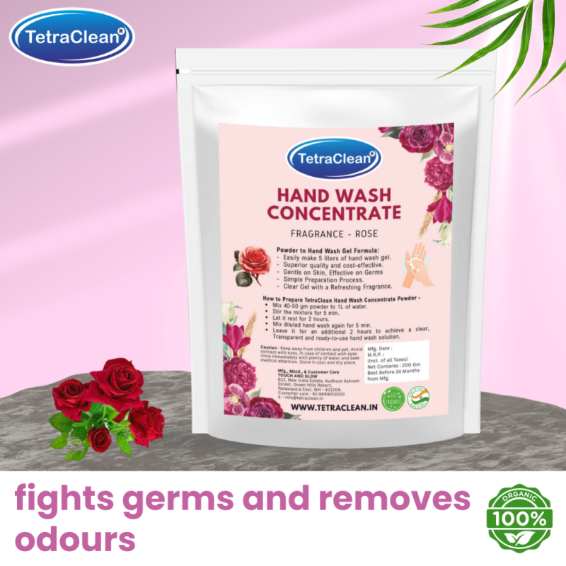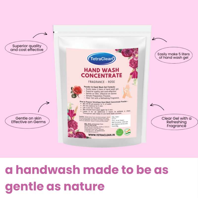 TetraClean Multi-Fragrance Hand Wash Concentrate Powder is a hygienic, economical, and skin-friendly formula designed to remove germs while leaving hands soft, fresh, and fragrant. Available in a variety of captivating fragrances like rose, jasmine, lemon, lavender, green apple, orange, aqua, aloe vera, haldi chandan, and strawberry, this concentrate powder easily makes up to 5 liters of gentle hand wash gel. Its advanced, concentrated formula ensures powerful germ protection while being gentle and moisturizing on the skin, keeping hands nourished even after frequent washes. The refreshing fragrances leave your hands smells revitalized for a pleasant cleansing experience. Suitable for home, office, schools, hospitals, and other commercial places, this product guarantees complete hygiene, cost-effectiveness, and lasting freshness with every use. Simply mix the powder with water, stir, rest, and prepare a clear, transparent hand wash gel ready for everyday use.