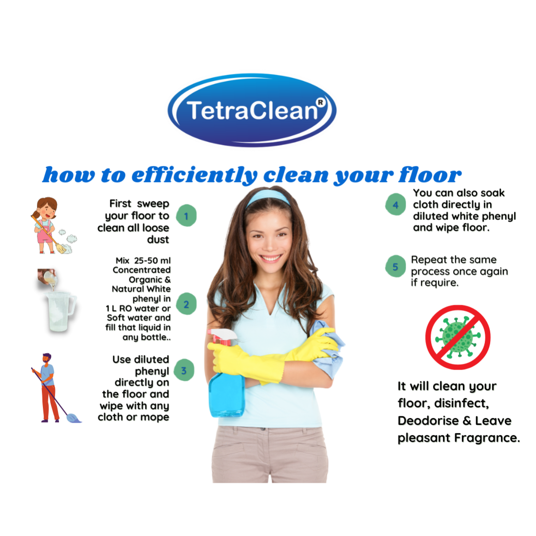 Antibacterial and eco-friendly TetraClean White Phenyl Concentrate delivers powerful floor cleaning with long-lasting fragrances of lemon, lemongrass, mogra, jasmine, lavender, pine, rose, citronella, and camphor. Removes stains, kills germs, and leaves your home fresh and vibrant.
