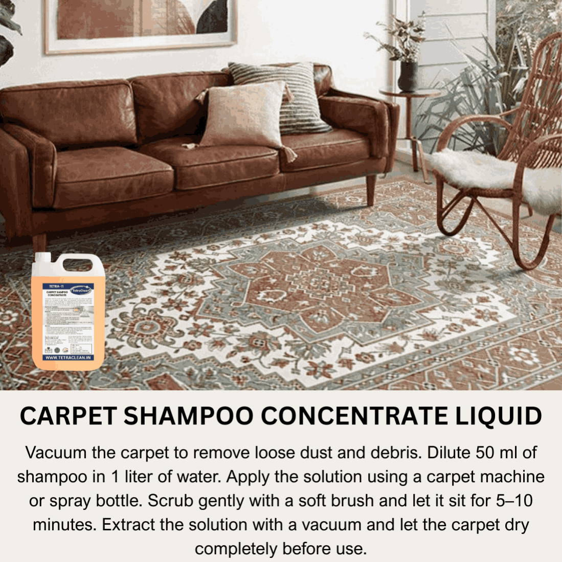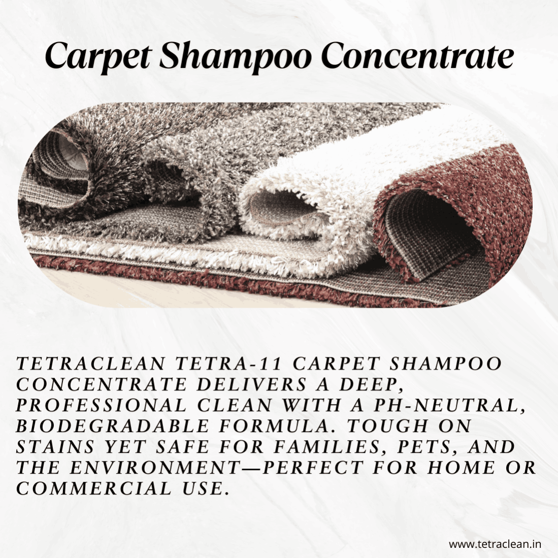 TetraClean TETRA-11 Carpet Shampoo Concentrate is a professional-grade formula designed to deliver spotless, hygienic, and fresh carpets for homes and businesses. Its advanced cleaning agents penetrate deep into carpet fibers, effectively removing dirt, dust, stains, and stubborn grime while being gentle and safe for families, pets, and the environment.