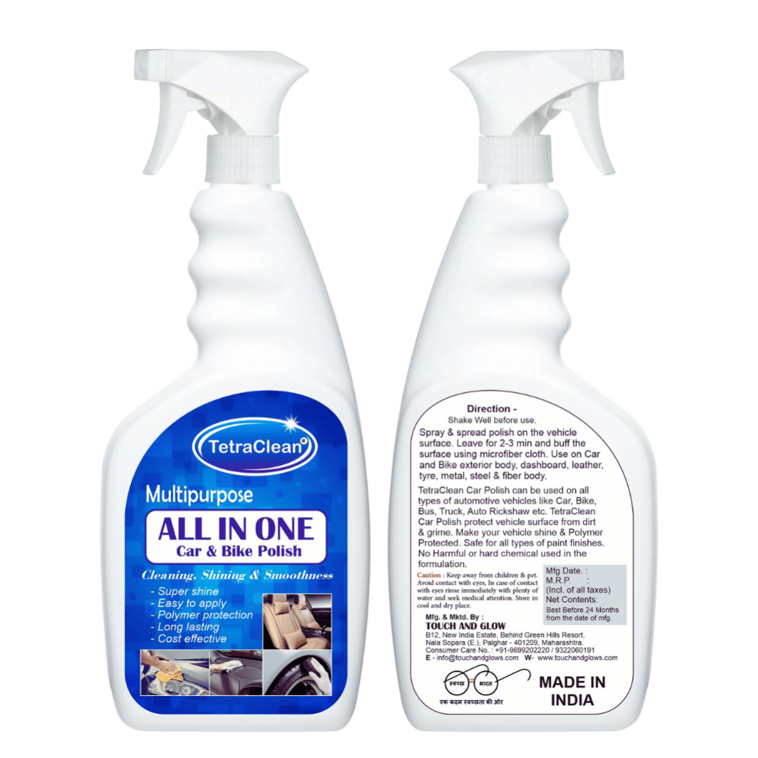 TetraClean All-in-One Car & Bike Polish is a multipurpose formula designed to give your vehicle a super shine, long-lasting protection, and smooth finish. It works effectively on car and bike exteriors, dashboards, leather, tyres, plastic, steel, and fiber surfaces. This easy-to-use spray not only enhances the look of your vehicle but also protects it from dirt, grime, and environmental damage. Free from harsh chemicals, it is safe for all paint finishes and surfaces, ensuring your car or bike always looks brand new.