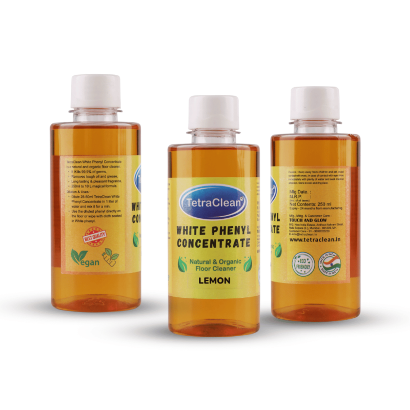 Antibacterial and eco-friendly TetraClean White Phenyl Concentrate delivers powerful floor cleaning with long-lasting fragrances of lemon, lemongrass, mogra, jasmine, lavender, pine, rose, citronella, and camphor. Removes stains, kills germs, and leaves your home fresh and vibrant.