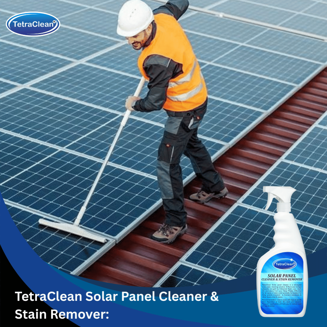 TetraClean® Solar Panel Cleaner is a streak-free, non-abrasive cleaning solution designed to remove dust, dirt, bird droppings, and hard-water deposits from solar panels. It enhances light absorption, improves panel efficiency, and leaves a spotless, shiny surface. Safe for all types of solar panels—residential, commercial, and industrial.
